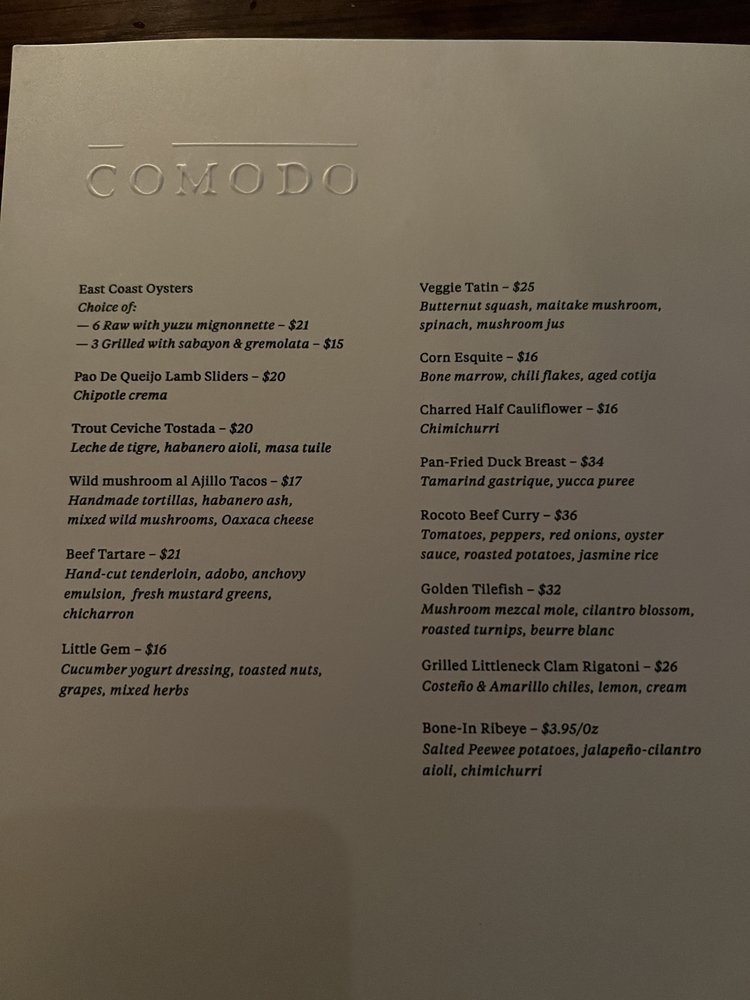 The mains are a treat, featuring the succulent 10oz Picanha ($43.75) and the flavorful Achiote Chicken ($55.25). Finish your meal with luscious desserts like Churro Donuts ($17.25) or the refreshing Coconut Yucca Cake ($17.25). Comodo promises an unforgettable dining experience, highlighted by excellent service and an inviting atmosphere that make every visit memorable.